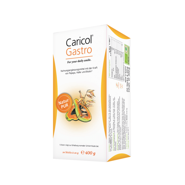 Caricol®-Gastro enthält die wertvollen Inhaltsstoffe einer patentierten Bio-Haferzubereitung sowie von Caricol®, einem patentierten Extrakt aus baumgereiften Bio-Papayas.