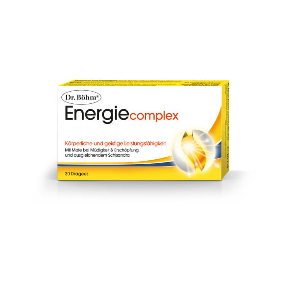 Müdigkeit und Energiemangel werden oft durch geistige und körperliche Überbeanspruchung verursacht. Echte „Energieräuber“ sind berufliche und private Stresssituationen, erhöhte geistige Anforderungen oder körperliche Belastung. Hier kommt Dr. Böhm® Energie complex zum Einsatz und gibt Ihnen den benötigten Schub an Energie.