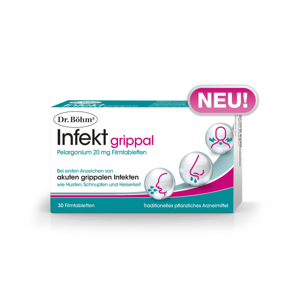Es empfiehlt sich, die Behandlung mit Dr. Böhm® Infekt grippal Pelargonium nach Abklingen der Krankheitssymptome noch einige Tage fortzuführen, um einen Rückfall zu vermeiden.