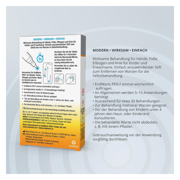 EndWarts PEN F ist eine effektive, lokal anzuwendende Lösung zur Selbstbehandlung von Warzen an Händen, Füßen und dem Körper. Die Lösung dringt unmittelbar in die Warze ein und hinterlässt keine Spuren auf der Haut. EndWarts PEN F enthält Ameisensäure, welche die Warze von innen heraus austrocknet, sodass der Körper die Warze sanft abstoßen kann.