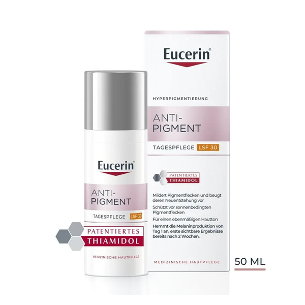 Eucerin® Anti-Pigment Tagespflege LSF 30 enthält Thiamidol®, einen wirksamen und patentierten Wirkstoff, der an der Ursache der Hyperpigmentierung ansetzt, indem er die Melaninproduktion vom ersten Tag an reduziert und bei regelmäßiger Anwendung bereits nach zwei Wochen erste sichtbare Ergebnisse zeigt. Es ist klinisch und dermatologisch erwiesen, dass es alle Arten von dunklen Flecken reduziert und ihr erneutes Auftreten verhindert.