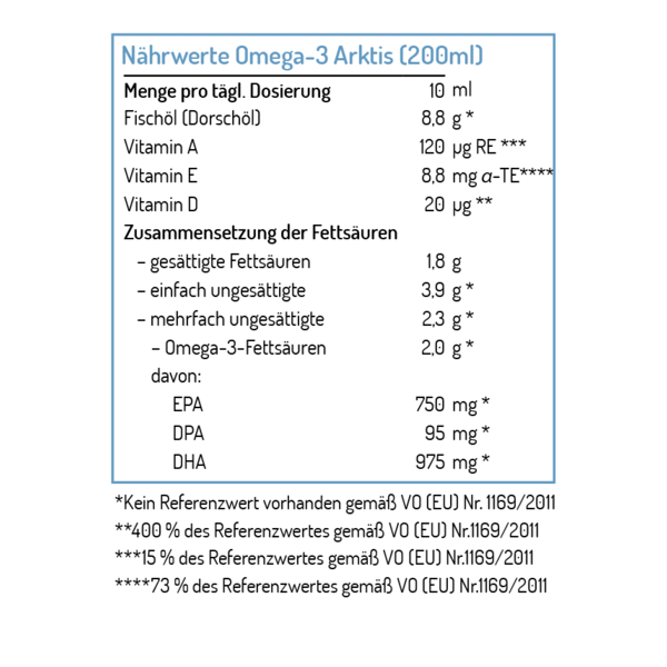 Omega-3 Arktis (200 ml) ist ein rein natürliches Dorschöl aus nachhaltigem arktischem Wildfang. Eine Tagesdosis (10 ml, ca. 1 Esslöffel) liefert 2.000 mg Omega-3-Fettsäuren (DHA und EPA).